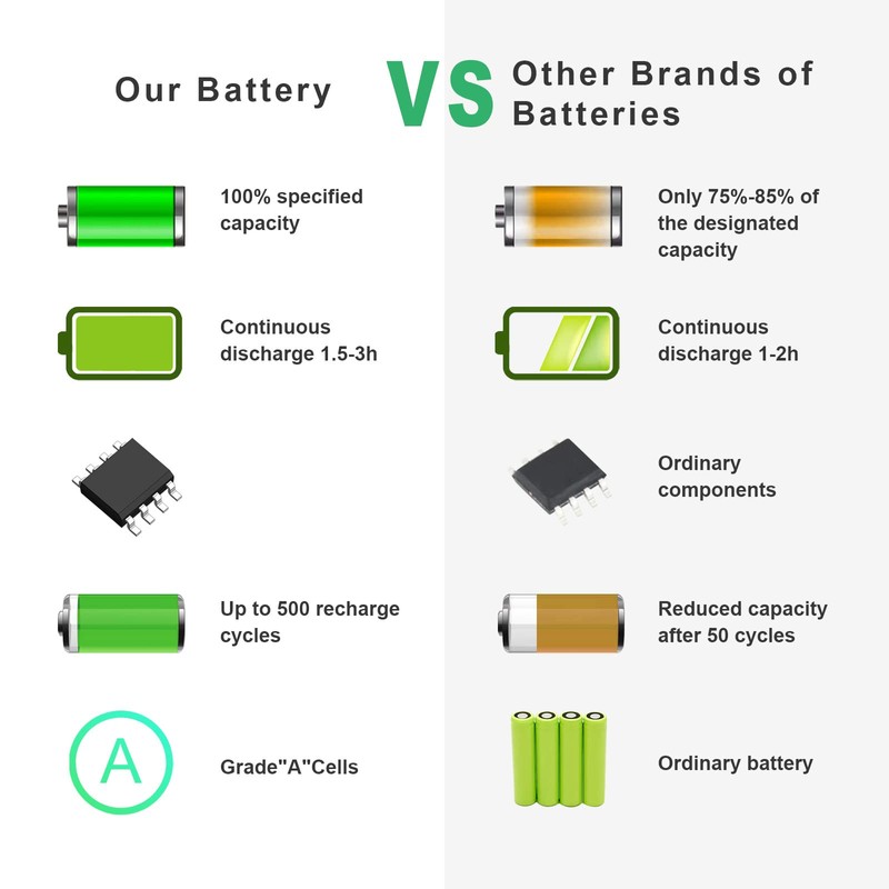 • ♣Security & Reliability: Our batteries are assembled from top quality material and circuit boards to ensure fast charges and low power consumption, 100% New from Manufacturer, Overcharge and Overdischarge Circuit Protection, Over-temperature and Short-circuit Protection, up to 500 recharge cycles over the life of the battery, meet OEM standard.