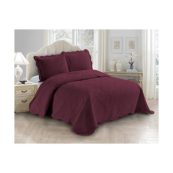 Fancy Linen 3pc Embossed Coverlet Bedspread Set Oversized Bed Cover Solid Floral Daisy Pattern New # Allis (Full/Queen, Burgundy)