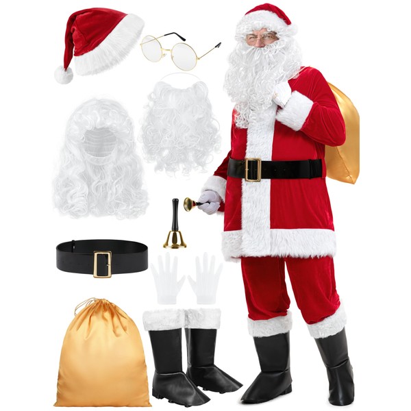 FancyFun Santa Claus Costume for Men, 12 Pieces Christmas Santa Suit Adult Men Outfit Suits Cosplay Velvet Coat Set A 3X-Large