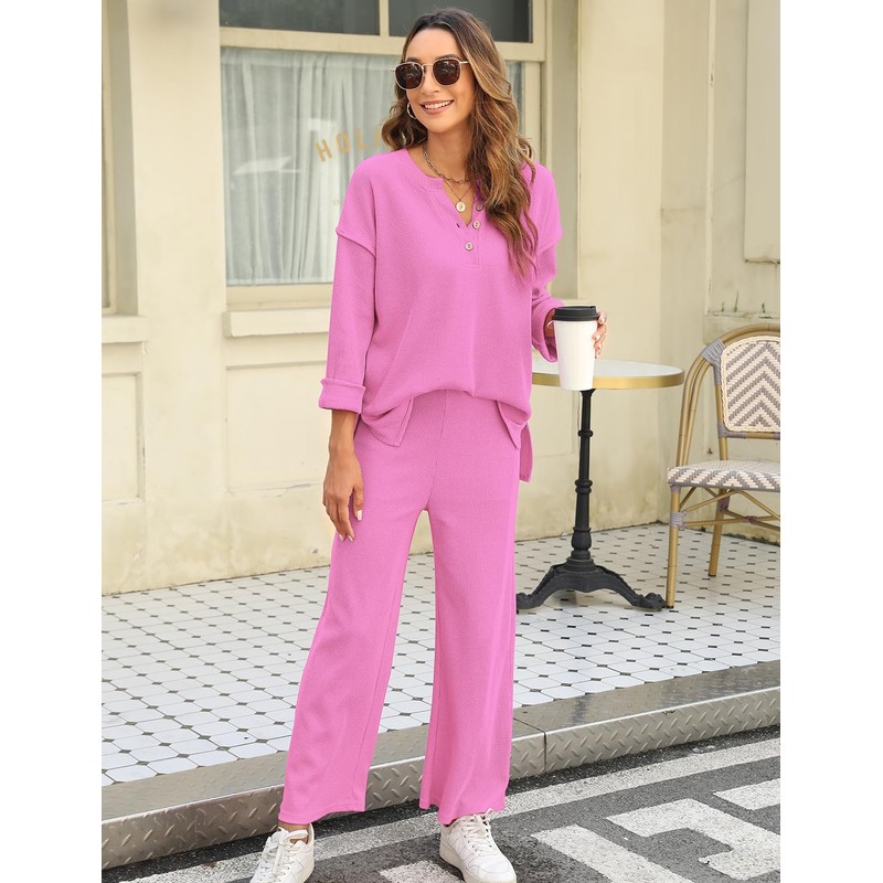 - Design: Waffle lounge sweatsuit, side slit, button V-neck adds a touch of sophistication and allows for easy on and off. Wide-leg pants not only provide a trendy and relaxed look but also offer freedom of movement. Dropped raglan sleeves design adds a stylish and modern twist to the overall silhouette, while the waffle texture adds texture and visual interest to the outfit.