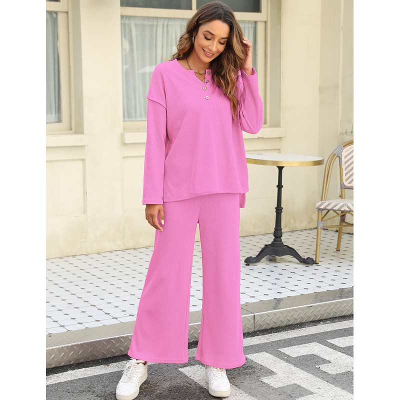 - Design: Waffle lounge sweatsuit, side slit, button V-neck adds a touch of sophistication and allows for easy on and off. Wide-leg pants not only provide a trendy and relaxed look but also offer freedom of movement. Dropped raglan sleeves design adds a stylish and modern twist to the overall silhouette, while the waffle texture adds texture and visual interest to the outfit.