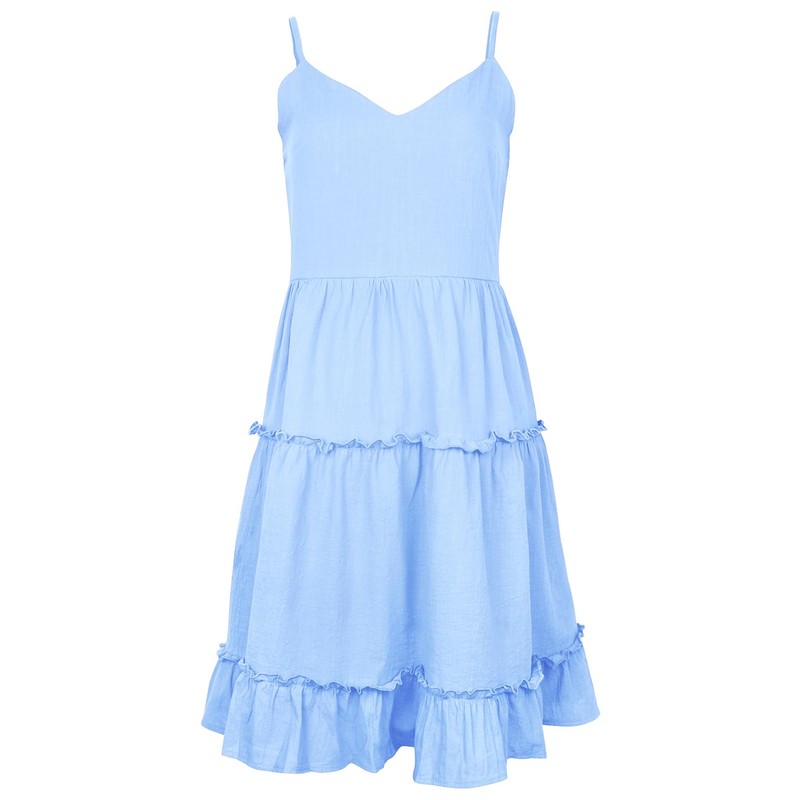 FANCYINN Women Solid Casual Tiered Mini Dresses Spaghetti Strap V Neck Backless A Line Swing Short Dress with Pockets Light Blue L