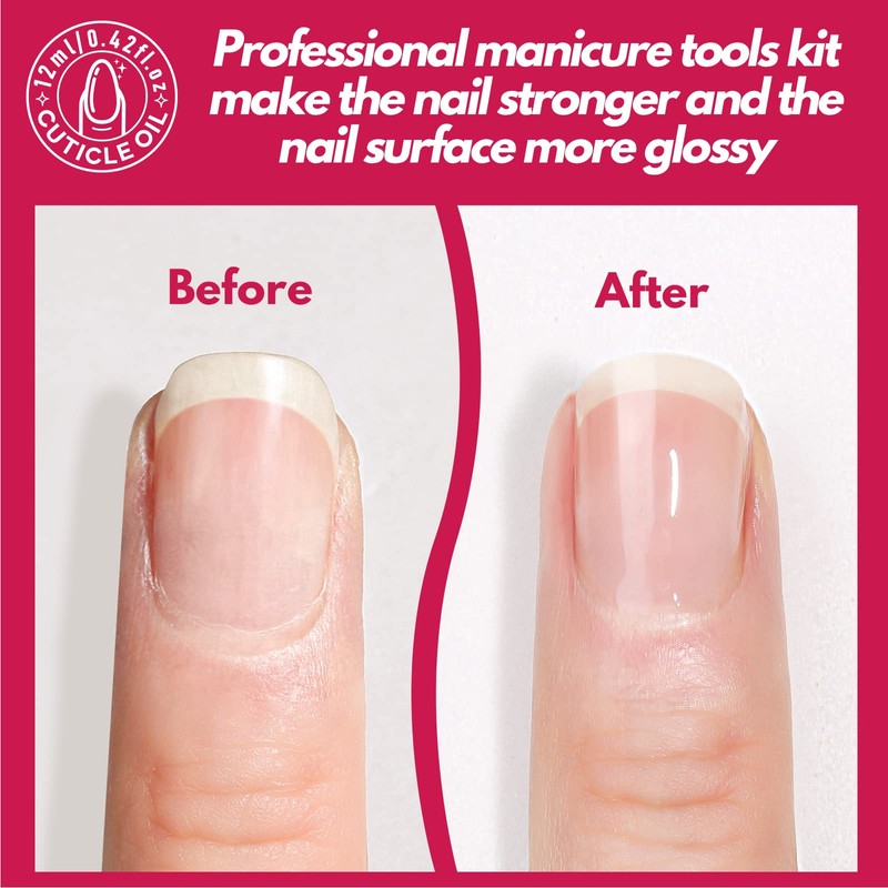 - Package Included: 3PCS 100/180 grit double sided nail files, 2PCS white and green nail polishing buffer, 1PCS white rectangular nail buffer block, 1PCS cuticle nipper, 1PCS cuticle pusher, 1PCS cuticle peeler scraper, 1PCS 12ml/0.42oz pomegranate fragrance nail cuticle oil and 1PCS nail dust brush. Professional manicure tools kit for daily nail care use and salon.