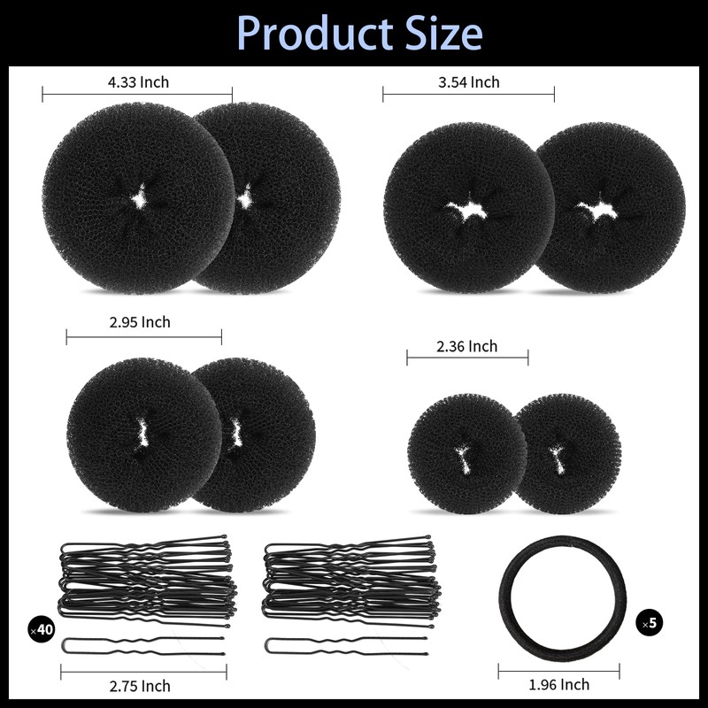 - 8 PCS Donut Hair Bun Makers with Bobby Pins and Hair Ties: Hair bun maker set includes 8 pcs black donut bun makers in 4 sizes: 2 extra-large, 2 large, 2 medium and 2 small, 40 pcs bobby pins(3 inches) and 5 black elastic hair ties, enough to satisfy most people’s need for a long run.