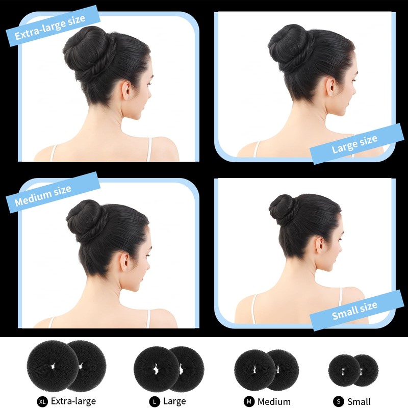- Various Size and Abundant Quantity: Our hair bun maker set contains 8 pcs natural color black donut bun makers in 4 sizes: extra-large, large, medium, and small, meet the needs of the majority. People with long hair and lots of hair volume choose extra large or large; medium-length and fine hair choose medium or small. 2 of each size provide more hair styling possibilities. 40 pcs bobby pins and 5 hair ties, a large number of hair styling tools to meet the long-term needs and also can be shared.