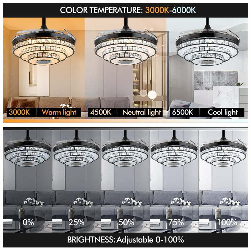- 【BLUETOOTH FANDELIER】 Black Crystal chandelier/Modern retractable ceiling fan /3 color & RGB 7 dimmable Lighting/Smart music player 4 in 1 Lighting Fixture.