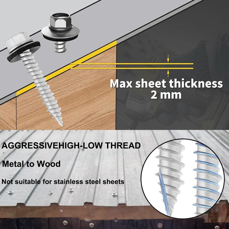 - 🔩【 NO PRE-DRILLING】: Self tapping metal roof screws feature a unique hexagonal head and self-tapping tip design, screw in directly. No pre-drilling is required and the self-drilling T17 Gash Point on screws makes for a rapid installation. Note: The metal plate should not exceed 2mm.