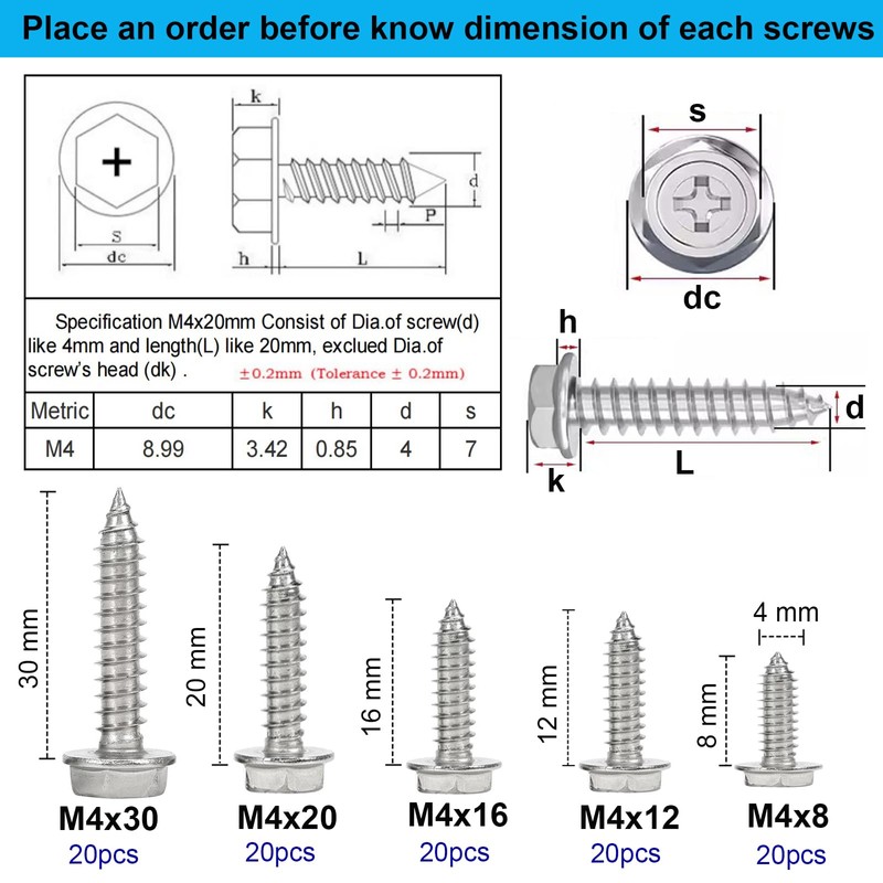 - Size: The set contains screws in different sizes (M4 x 8/12/16/20/30 mm total 5 sizes), which are suitable for different applications. In general, their lengths and diameters differ, and the user must choose the appropriate size according to the specific requirements.