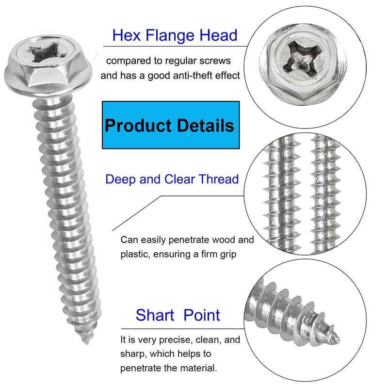 - Head type: the screw heads are equipped with a hexagonal flange design to allow easier installation and provide a larger contact surface for better strength. This head type not only provides good torque, but also fits the threads better.