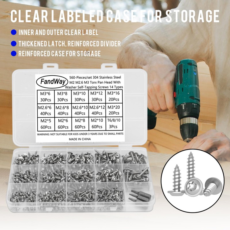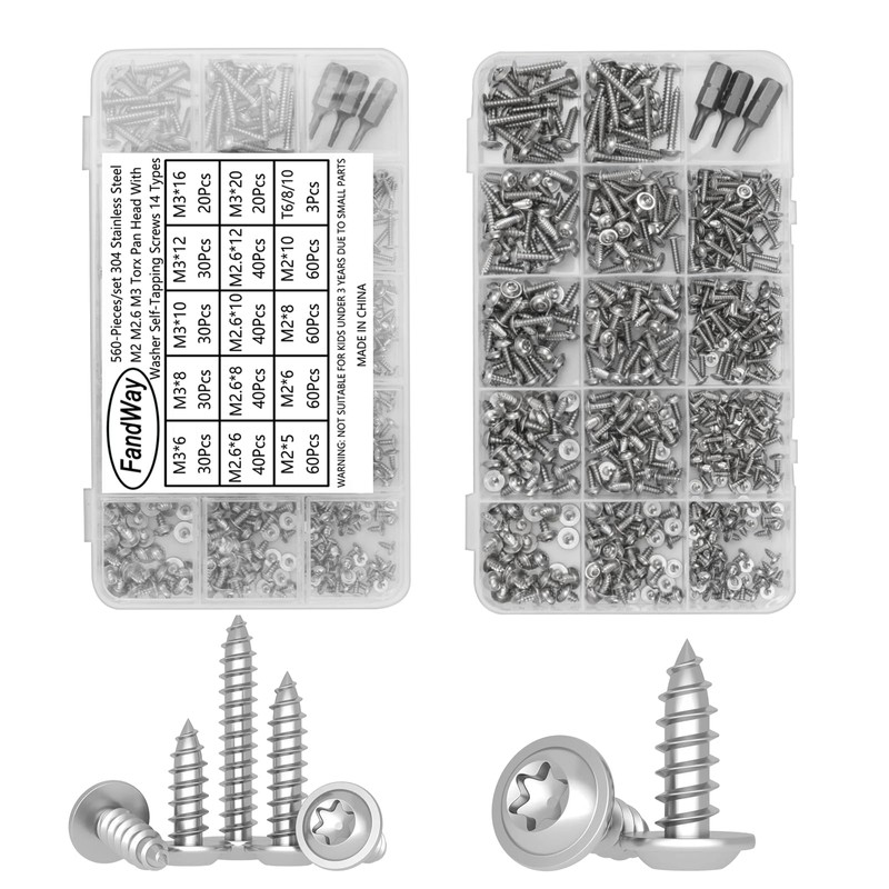 FandWay M2 M2.6 M3 Tapping Screws Flat Head Screws Set, 560 Pieces Torx Self-Tapping Screws, Wood Screws Stainless Steel Flat Head Torx Self Drilling Screws Assortment with T6 T7 T8 T10 Bits