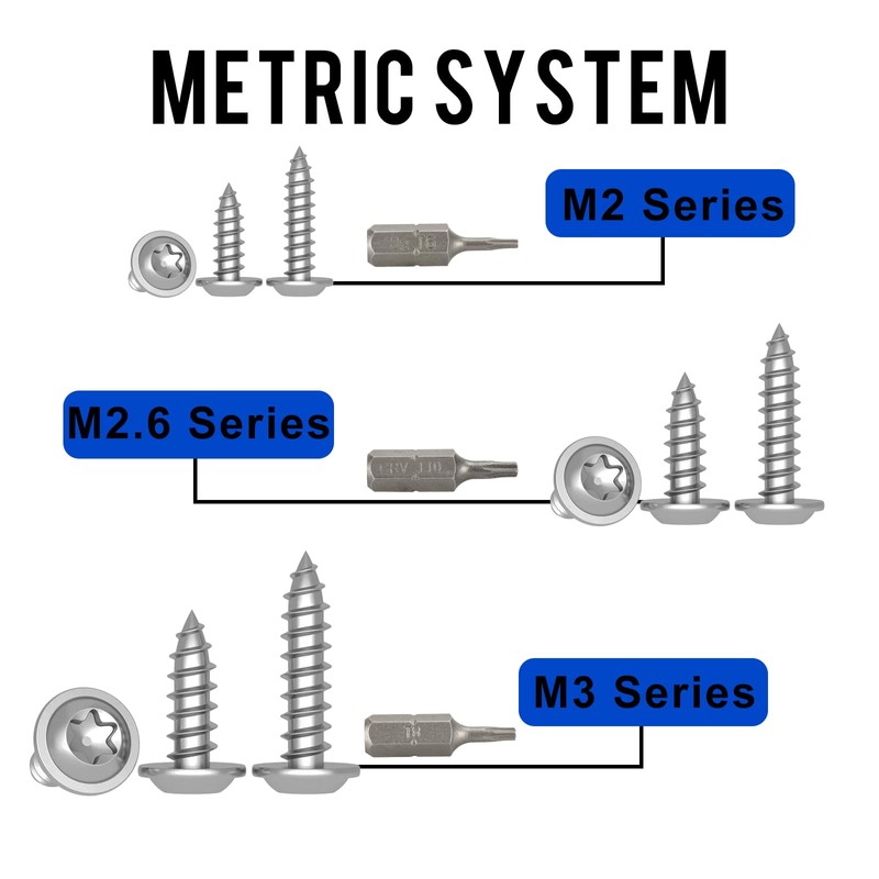 - Versatile size selection: The set includes screws in different sizes (M2x5/6/8/10mm---M2.6x6/8/10/12mm --M3x6/8/10/12/16/20mm, total 14 sizes). The screws are suitable for automotive parts, ATM machines, household repairs, wood processing, security technology and other theft prone applications.