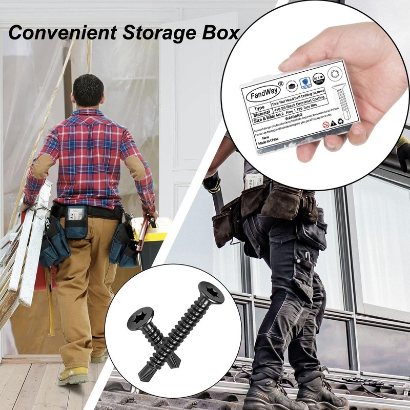 FandWay Pack of 100 Torx Drilling Screws, Countersunk Head Self-Drilling Screws, M4.2 x 13 mm Flat Head Self-Drilling Screws, Stainless Steel 410 Black Tapping Screws, Metal Roofing Screws Assortment