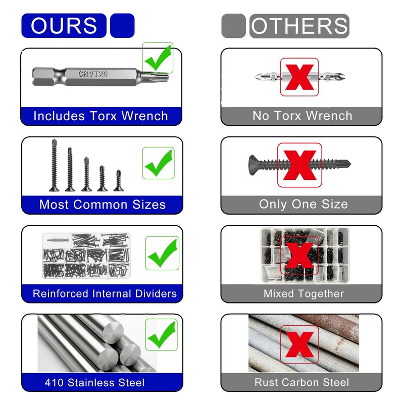 - Construction & Function: Self-drilling tip with cutting grooves or spiral grooves - combines drilling and tapping in one step. No pre-punching required! Directly penetrates metal sheets, wood, plastic and more for quick assembly.