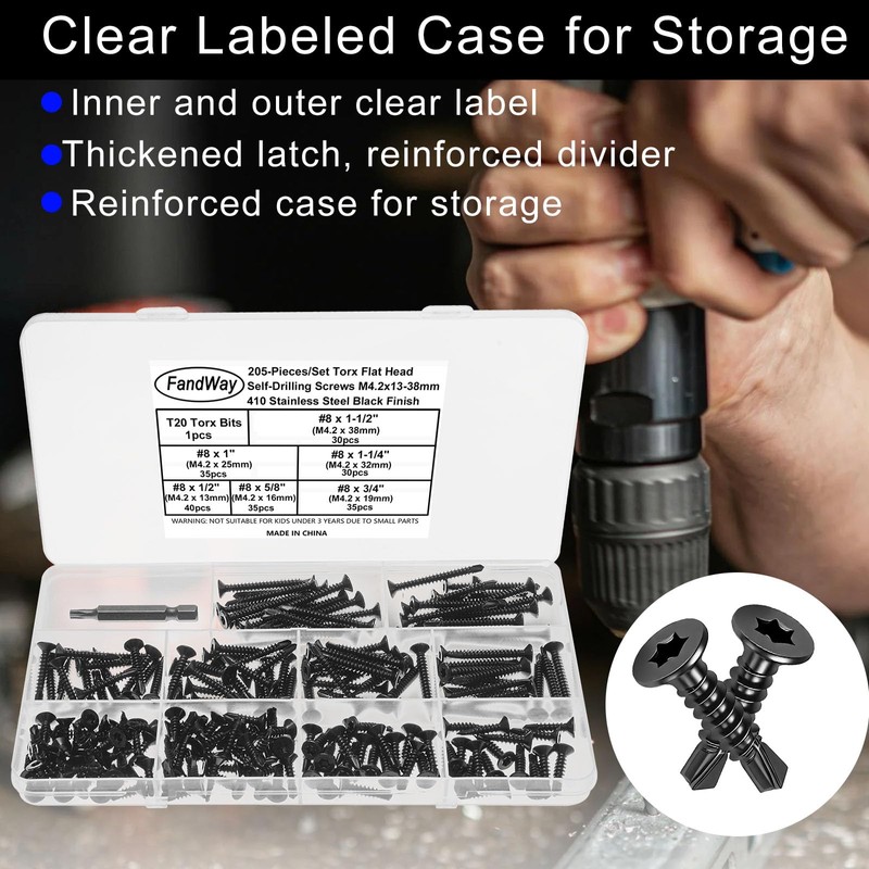 FandWay Pack of 205 Torx Drilling Screws, Countersunk Head Self-Drilling Screws, M4.2 x 13 ~ 38 mm Flat Head Self-Drilling Screws, Stainless Steel 410 Black Tapping Screws, Metal Roofing Screws