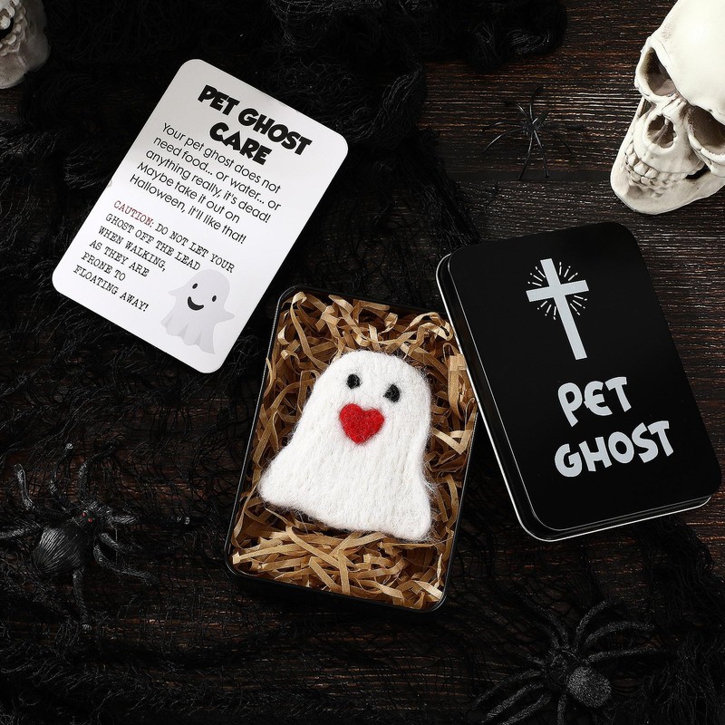 - Adopt a Ghost: this set includes 1 felting ghost, 1 black tinplate box, 1 adoption card and 1 packet of raffia grass filler; It's everything you need to adopt your very own ghost, ideal for lovers of the spookier side of life, or for adding a bit of light hearted fun to your Halloween celebrations