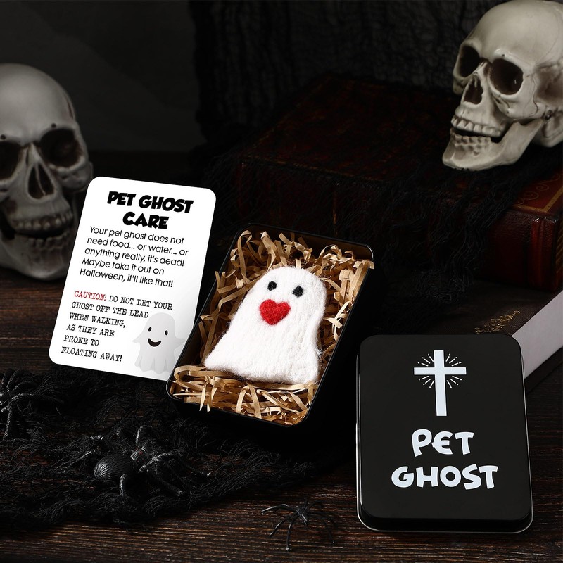 - Quality Craftsmanship: handmade with care, your adorable ghost is crafted from soft felt material; The sturdy tinplate box is ideal to keep your new spooky friend safe; Spread the raffia stuffing on the bottom of the box, put felting ghost on top and there you have adopted a ghost