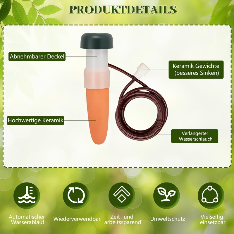 - 【Einfache Anwendung】Einfach den Bewässerungskegel für 15 Minuten in Wasser einweichen, dann in die Erde stecken und den Schlauch in einen Wasserbehälter führen. Ohne Strom, ohne Timer – das System beginnt sofort zu arbeiten und versorgt Ihre Pflanzen zuverlässig