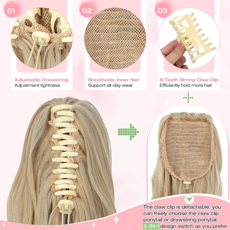 - 2-IN-1 Ponytail Design: This long ponytail extension claw clip is detachable, you can freely choose the clip in ponytail or drawstring ponytail. 2 ways to wear, switch at your will! Suitable for medium/thick volume who desired more hair, while not recommend for too thin hair