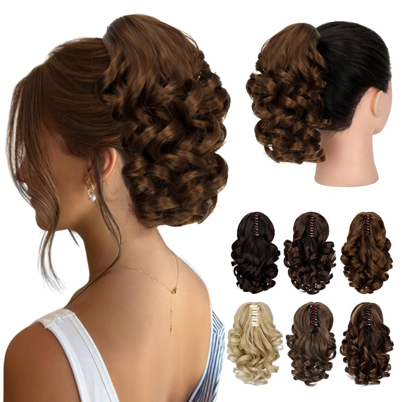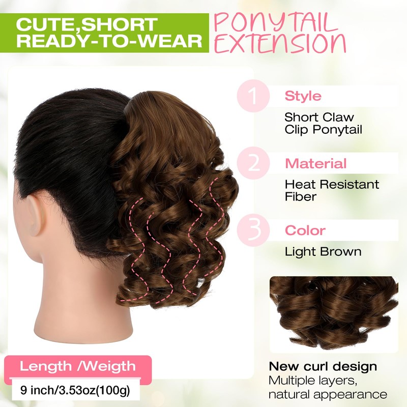 Fanguilar Ponytail Extension, 9" Short Claw Clip Ponytail Extension Curly Wavy Jaw Clip on Pony Tails Hair Extension Synthetic Hairpiece for Women, Light Brown