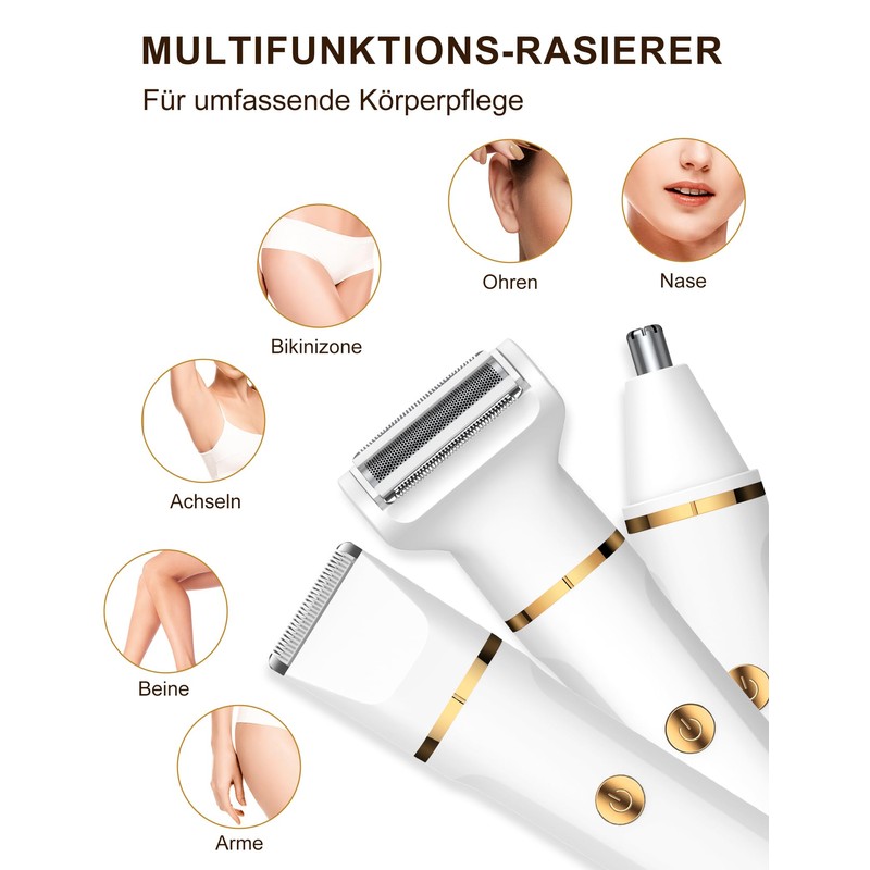 - [MULTIFUNKTIONALER RASIERER DAMEN] Erleben Sie Vielseitigkeit mit unserem rasierer damen elektrisch, das 3 austauschbare Schneidköpfe umfasst. Der haartrimmer eignet sich ideal für die Haarentfernung auf großen Flächen wie Beinen und Armen. Der scherkopf mit schwimmender Folie sorgt für eine gründliche und glatte intimrasierer für frauen von kurzen und verbleibenden Haaren an bikinizone oder achseln, während der nasenhaartrimmerkopf Nasenhaare schnell und präzise entfernt, ohne zu ziehen.