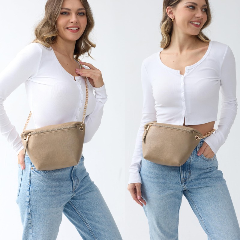 - Crafted with durable vegan leather and adorned with polished gold hardware, this Fanny Pack adds a hint of shine, seamlessly complementing both casual and fashionable attire. Enjoy the freedom to wear it in multiple ways, embracing the flexibility of this cute and modern belt bag.
