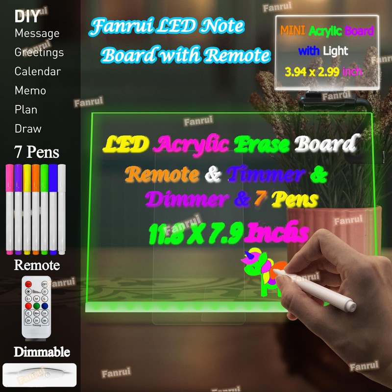 Fanrui Acrylic Dry Erase Board with Light, 7 Colors Clear Desktop Note Memo Board with Remote & Timer, Dimmable 11.8 X 7.9” Rewritable Night Light Creative Lighted Message Board for Home Study Work