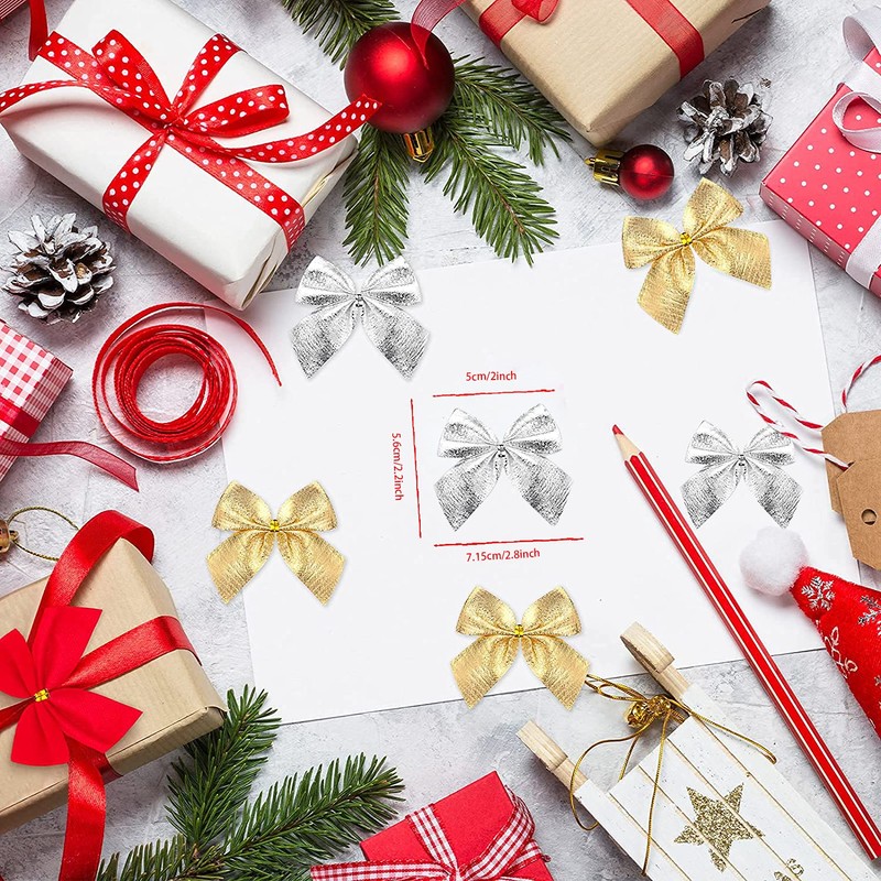 - Handmade: each bow knot is approx. 5 x 6 cm in size, pure handmade, with a slight error in size that does not affect the use. On the back of each Christmas bow there is a golden metal wire, which is easy to remove fixed on bags or other items superior.
