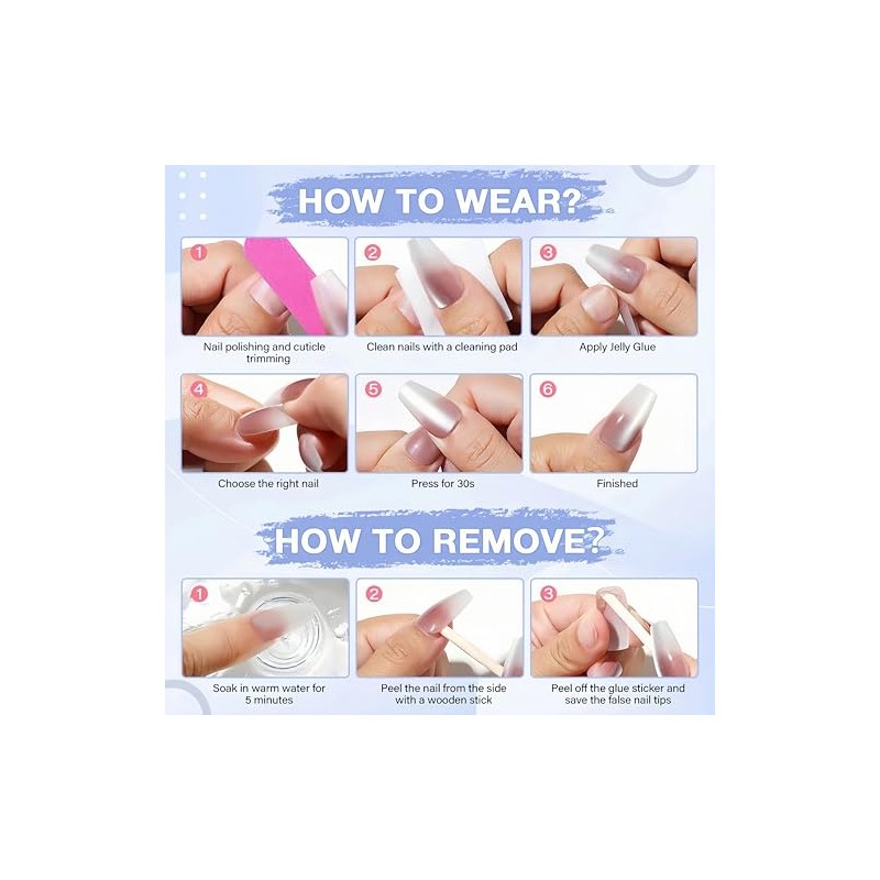 • 【Easy to Apply】Just clean your nails, then choose a suitable nail size, apply jelly glue on your nails and press for a moment, you can have beautiful nails in a few simple steps. Normal care will last a few days.