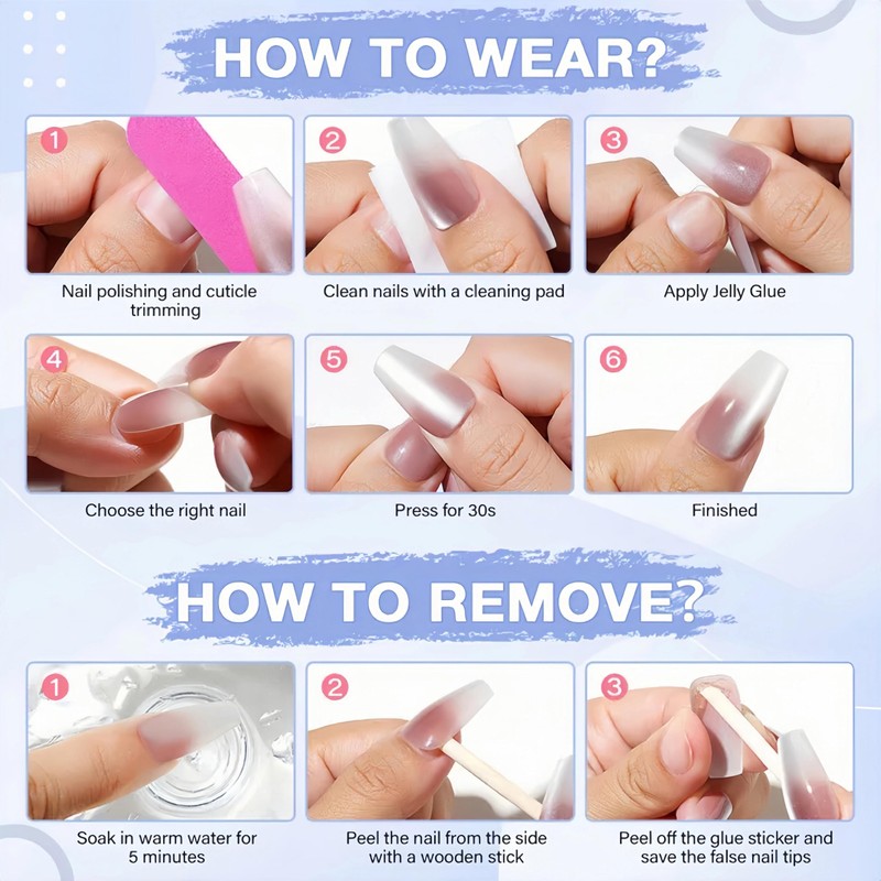 - 【Easy to Apply】Just clean your nails, then choose a suitable nail size, apply jelly glue on your nails and press for a moment, you can have beautiful nails in a few simple steps. Normal care will last a few days.