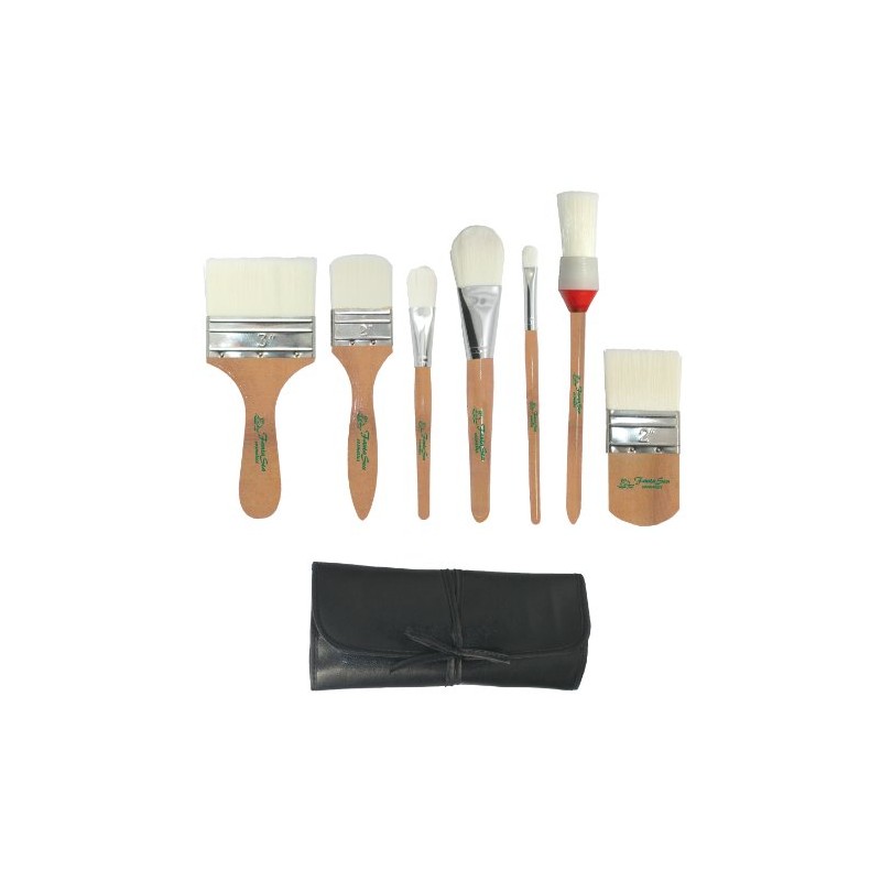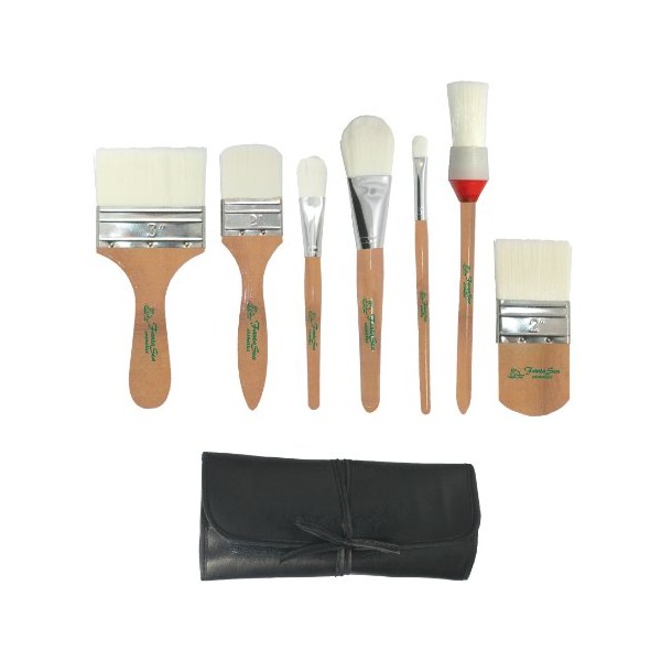 - Includes one each of the following in a deluxe roll-up case: 3" long handle flat brush, 2" long handle flat body brush, 1" oval body brush, 1-1/2" oval body brush, 7/8" oval body brush, 1" diameter round body brush, 2" short handle flat body brush