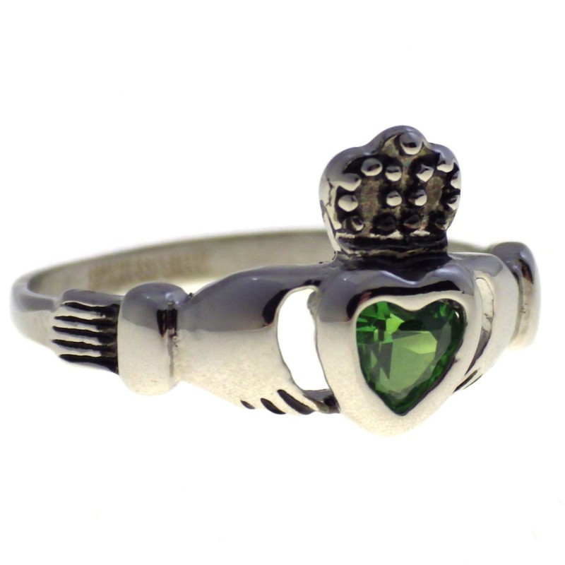 • he claddagh has a heart shaped emerald green color cubic zirconia crystal bevel mounted in the center of the heart. The ring is made of solid hypoallergenic 316L surgical stainless steel and has a high polish finish. This wedding band approximately measures 11.6mm tall at the crown/heart down to 2mm wide at the back of the band.