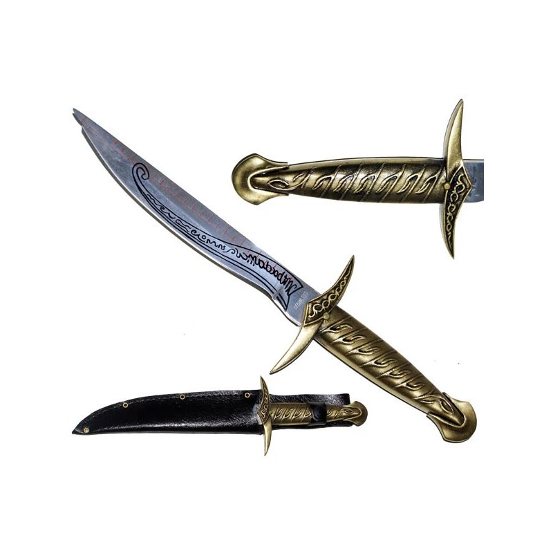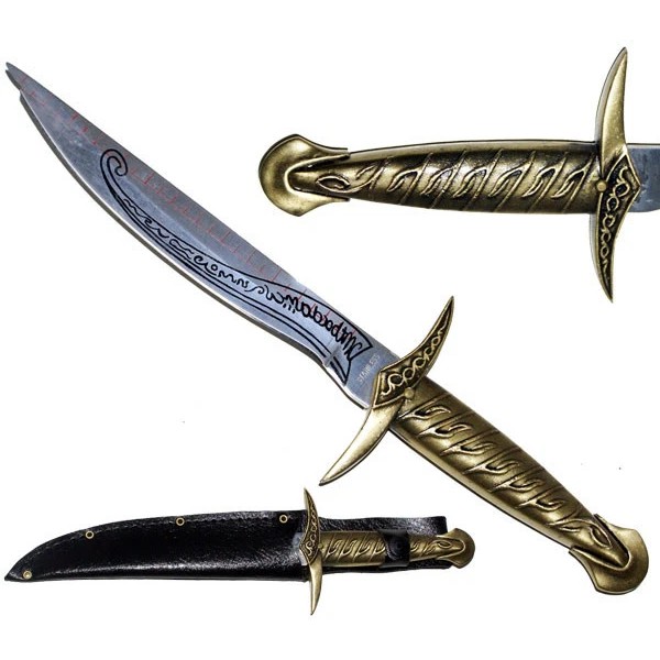 Item # HK02023TSThe Fantasy Sting Dagger : The 6" blade is silver with a painted design and made of Stainless Steel. The handle is antique gold in color and has a unique design on it. Comes with a snap closed leather sheath.