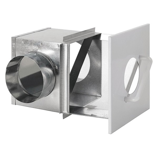 Galvanized metal lint trap for dryer boosting applications. Use when duct length between dryer and booster fan is less than 15 feet. Fits 4-inch duct. Features pull out white door with a view window with attached removable lint filter for easy cleaning and 1/2" flange for flush mount installation. The lint trap complements all Fantech dryer booster fans.