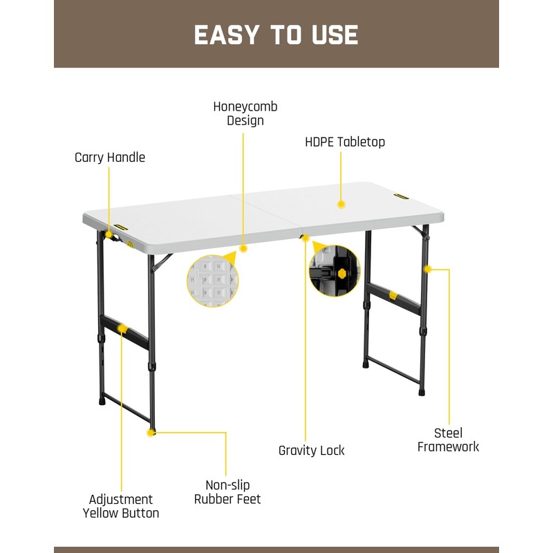 FanttikOutdoor 4ft Portable Folding Table, One-Handed Height Adjustment, 4 Heights, Gravity Lock, Carry Handle, Indoor Outdoor Heavy Duty Fold-in-Half Utility Table, Party, 1 Pack, White Zeta X4 Pro