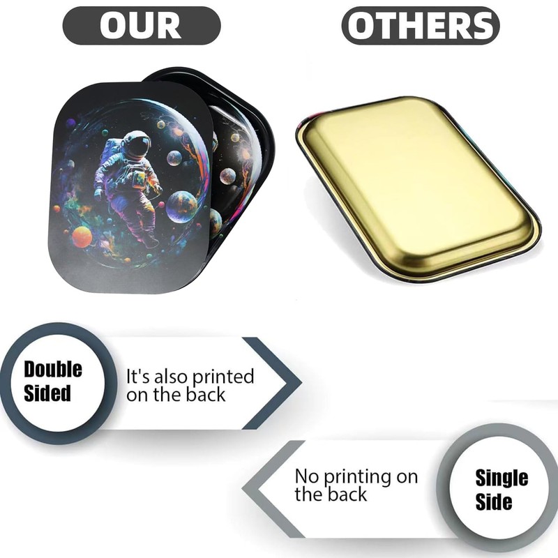 - 【PORTABLE SIZE】The size of 7" x 5.5" and the smooth curved edges make this metal tray easy to carry and convenient to use in any occasion. Whether you're indoors, outdoors, or traveling this tray is perfect to take with you.
