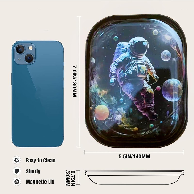 FANVANAI Metal Tray with Soft PVC Magnetic Lid Small Cute Decorative Tray Ideal Storage for Home or on The Go, 7"" x 5.5"" (Black- Astronaut)