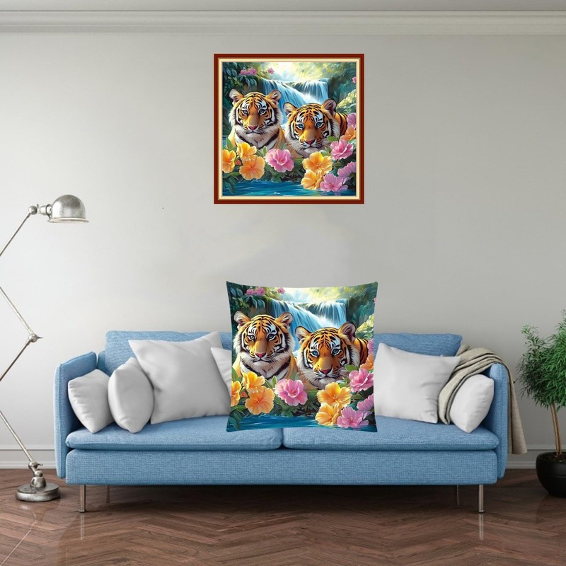 Fanxvivy Stamped Cross Stitch Kits for Adults Beginners Pillow Needlepoint Kit with Embroidery Pattern Needlework Kit Prestamped Stitches Kit 11CT Cross Stitching-Flower Tiger 18x18 inch