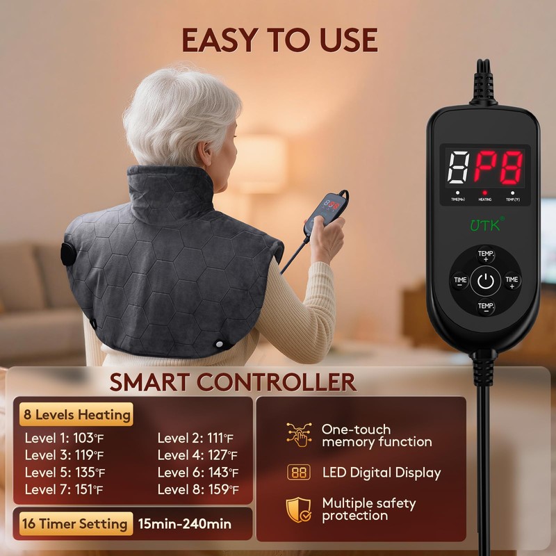 - Warm Gift —— UTK neck and shoulder heating pad allows you to deeply relieve pain and soreness, quickly heat up to promote blood circulation, and relax muscles. It can also be applied to the back, legs, abdomen, buttocks, etc. It is the best holiday/birthday gift for elders, colleagues, family members and sports enthusiasts.