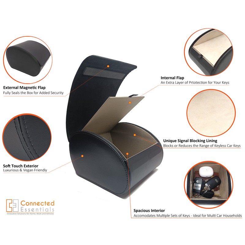 - NEVER LOOKS OUT OF PLACE –we have utilised our vast experience with home storage accessories to deliver a premium faraday box for car keys with soft touch black PU Leather finish and unique and contemporary curved design with a magnetic flap to ensure that our rfid car key box fits tastefully into any home or office and never looks out of place.