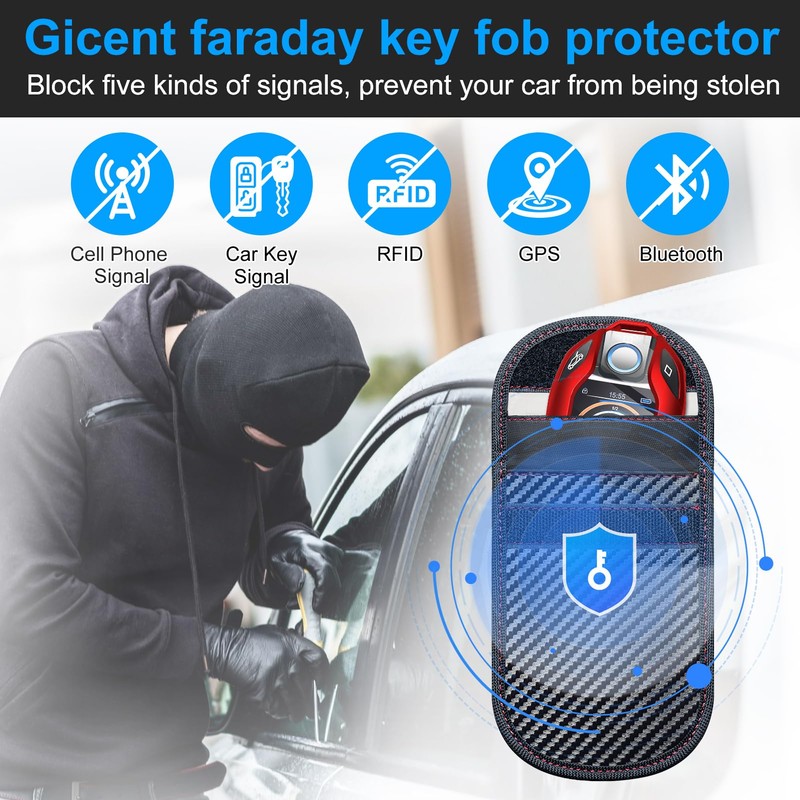 • ๐Ÿ“ถ ๐๐ฅ๐จ๐œ๐ค ๐…๐ข๐ฏ๐ž ๐Š๐ข๐ง๐๐ฌ ๐Ž๐Ÿ ๐’๐ข๐ ๐ง๐š๐ฅ๐ฌ. GICENT faraday pouch for car key fob is made of premium carbon fibre material and waterproof military-grade RFID blocking cloth, so that it can effectively block RFID, including car key signal, Bluetooth,cell phone signal. GPS and WiFi also can be blocked effectively. Putting your car key fob into our faraday pouch will prevent your car key signal from being duplicated and amplified by thieves, which can prevent thieves from starting and driving away your car. Protecting your car always.