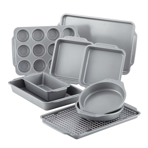 Farberware Nonstick Steel Bakeware Set with Cooling Rack, Baking Pan and Cookie Sheet Set with Nonstick Bread Pan and Cooling Grid, 10-Piece Set, Gray