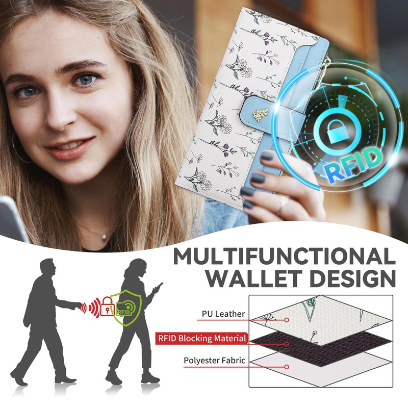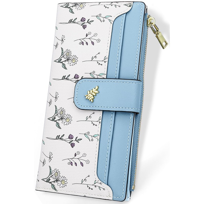[Farcauo] Cute RFID Long Wallet Green Billfold Card Holder ID Window Minimalist Flower Design Leather Coin Bag Kawaii Travel Cash Wallet, #Eb Blue Flower Women's Wallet