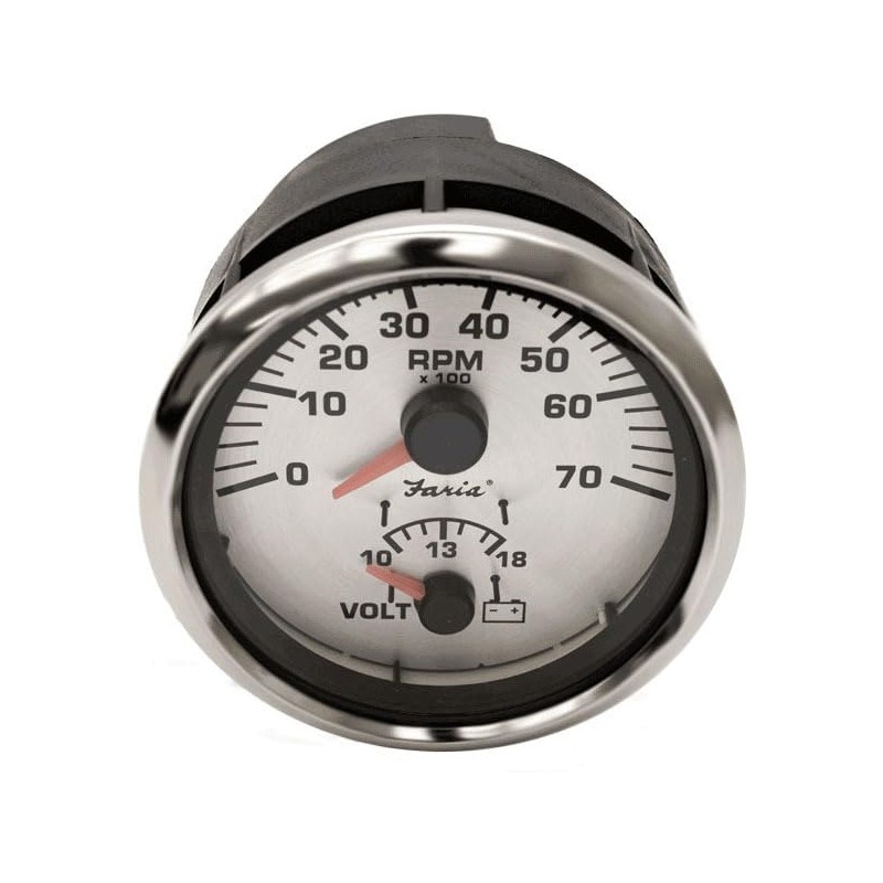 Boat part number 8302735 is a new Spun Silver Series Multifunction Tachometer / Volt gauge from Faria, part number GTC048A . Commonly used on Lund Boats, may be used on other boats. Compatible with Mercury engines.