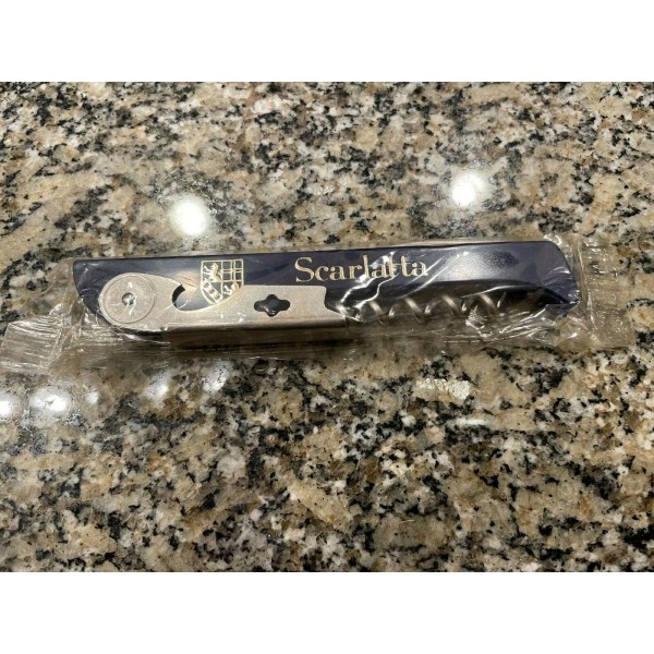 Brand NEW blue corkscrew made by "Farm", in sealed plastic.  The side of handle with a gold lion shield and lettering  for  "Scarlatta"
