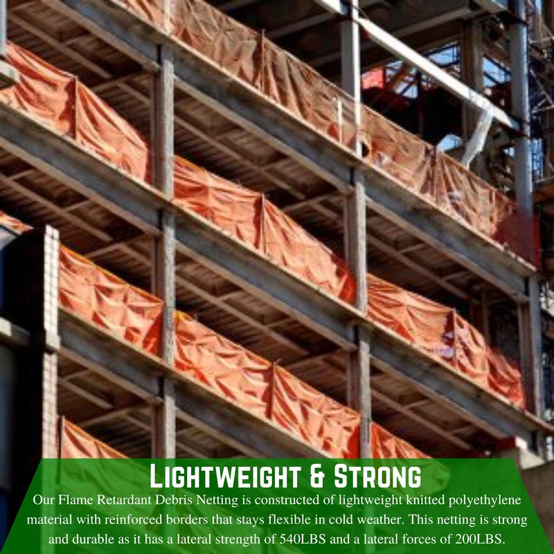 - Lightweight & Strong - Our Flame Retardant Debris Netting is constructed of lightweight knitted polyethylene material with reinforced borders that stays flexible in cold weather. This netting is strong and durable as it has a lateral strength of 540LBS and a lateral forces of 200LBS.