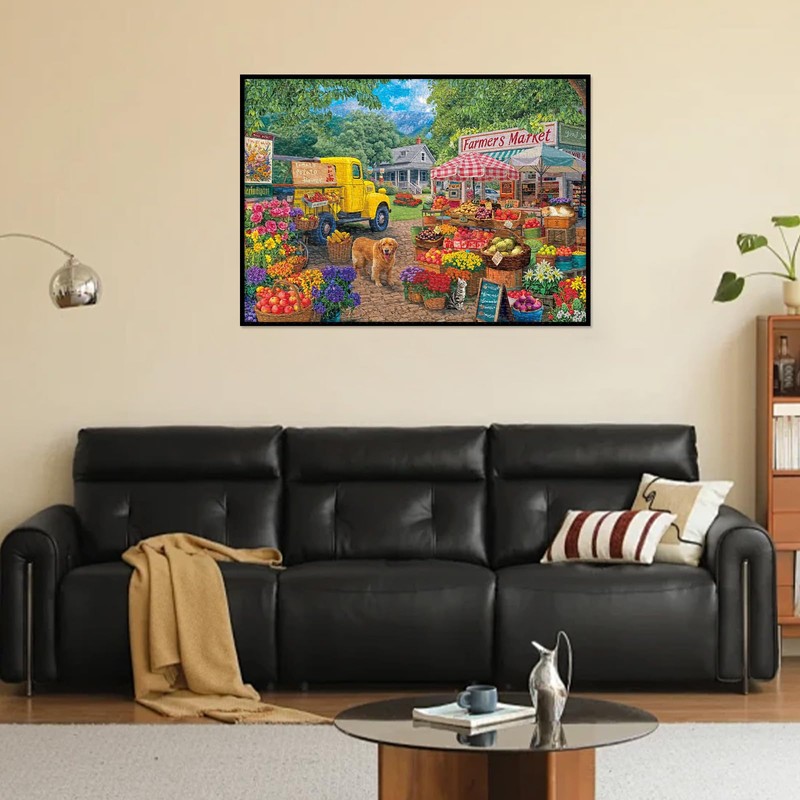 - Vibrant Farmers Market – Immerse yourself in a lively farm stand scene filled with fresh fruits, vegetables, flowers, and bustling marketgoers. Perfect for puzzle lovers who enjoy charming, detailed artwork.