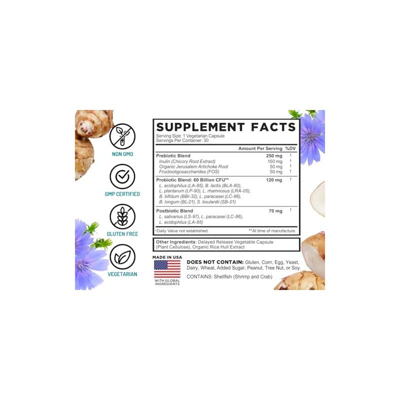 • 3-in-1 Advanced Gut Harmony: Prebiotics, Probiotics and Postbiotics work synergistically to support digestive comfort, enhance nutrient absorption, and bolster your immune system. FarmHaven's advanced 60 Billion CFU formula cultivates a thriving gut microbiome for overall well-being with 8 unique probiotic strains including the clinically studied L. acidophilus and B. Lactis strains to assist in the breakdown and absorption of nutrients from your food.*