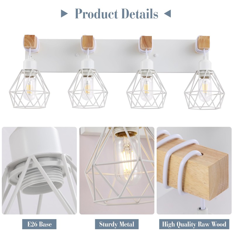 Farmhouse Vanity Light for Bathroom, 4-Light White Wood Bathroom Vanity Light Fixtures Over Mirror, Rustic Sconces Wall Lighting with Metal Lampshade for Living Room, Bedroom, Hallway