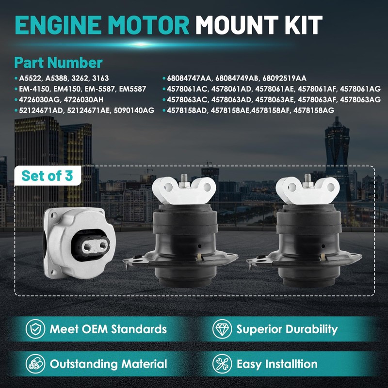 - ✅【Part Number】Engine Motor Mount and Transmission Mount Set A5522, A5388, 3262, 3163, EM-4150, EM-5587, 4578061AC, 4578061AD, 4578061AE, 4578061AF, 4578061AG, 4578063AC, 4578063AD, 4578063AE, 4578063AF, 4578063AG, 4578158AD, 4578158AE, 4578158AF, 4578158AG, 68084747AA, 68084749AB, 68092519AA, 4726030AG, 4726030AH, 52124671AD, 52124671AE, 5090140AG. New engine motor mount set contributes to smoother engine operation, improved gear shifting, reduced noise, and enhanced overall driving experience.