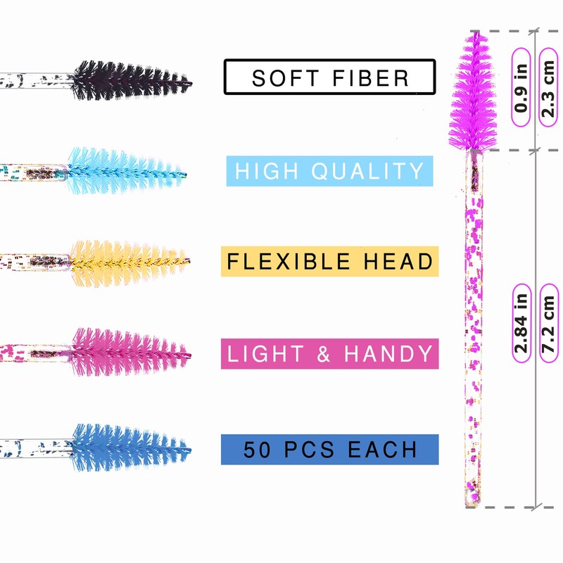 Product Specifications:  Material: Each brush is made of very soft fiber bristles and A grade quality glittered plastic.  Color: Eyelash brush is available in two relaxing colors (Aquamarine and Pink)  Size: Mascara wand size: 3.9 inches or 9.8 cm Bristle brush head Size: 1 inch or 2.5 cm Weight: 100 grams  Product Features:  Multipurpose: These eyebrow brush can be used for combing eyebrows, eyelashes and extensions, application of mascara, oils, colors and gels.  Disposable: Lash cleaning brush is made with focus of disposability so you don’t have to re-use it again and escape itchy eyes.  Packing: Eye lash brushes are packed in a way that brushed don’t get damage while you travel and can be placed in your hand carry easily.  Packet: One packet includes 300 disposable mascara wands (50 Aquamarine, 50 pink, 50 Golden, 50 Blue, 50 Black, 50 Magenta)